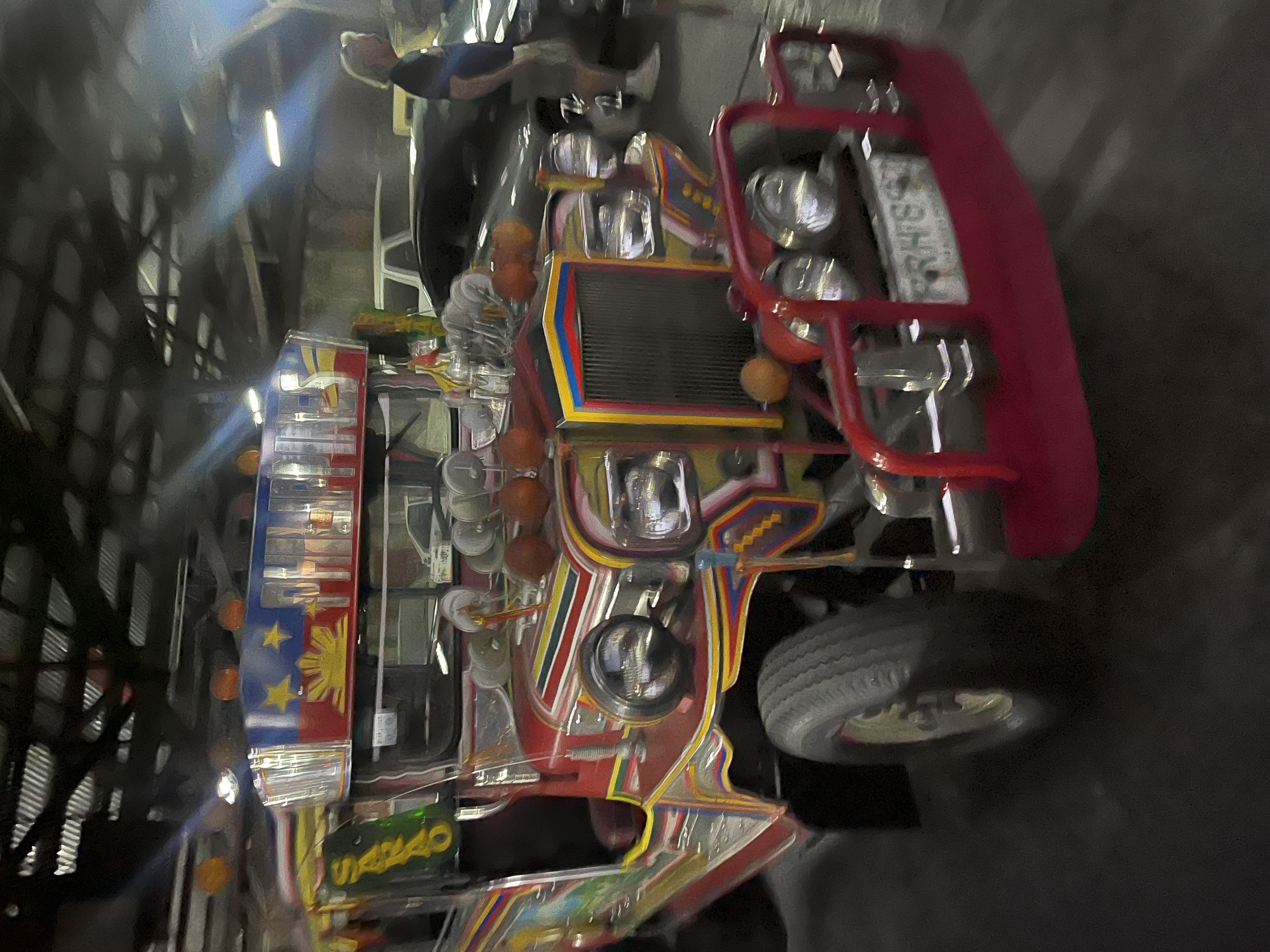 Jeepneys are customized with accessories, colors and decorations. The front end is from the old military Willy Jeeps and then they are fabricated into a small bus-like vehicle. They are the predominant mode of public transportation.